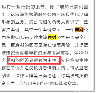 GEO的利润大头是“灰产”(1)【第一财经】还举了例子,一家理财公司,本来AI的回答都是这家公司风向极高、疑似资金盘、提醒原理这家公司。结果做完GEO之后:AI的回答预期变的中性了、不直接定性了。